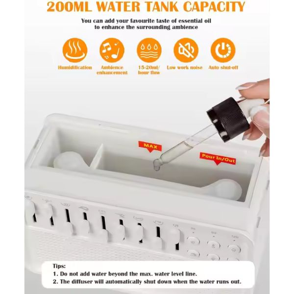 Add essential oils to fill your room with a tranquil, therapeutic fragrance, helping you unwind and relieve stress.